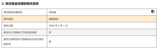 另外桂跃强也不出意料的离职了,他是以“健康原因”为由,卸任了名下所有基金,算是彻底告别公募了。